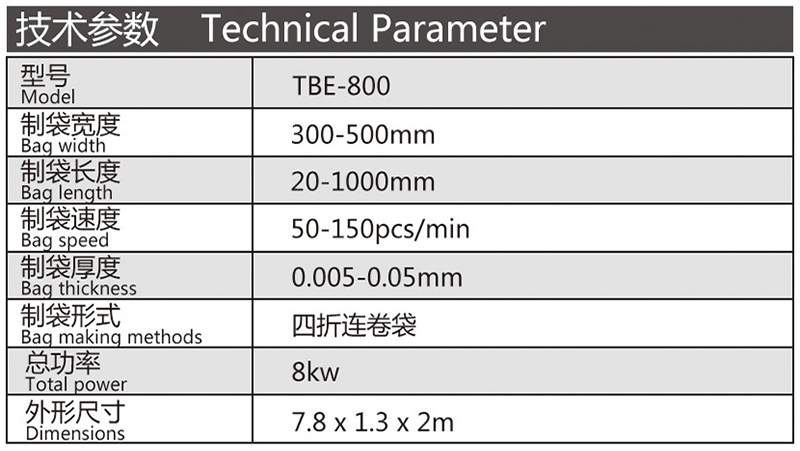 機器特性 此設備為生產連卷四折平底垃圾袋的專用設備,單通道高速無拉伸操作簡便,底封好,收卷整齊,個數準確,手動手卷。此設備采用全鋼板一體而成,用電220v照明電即可。